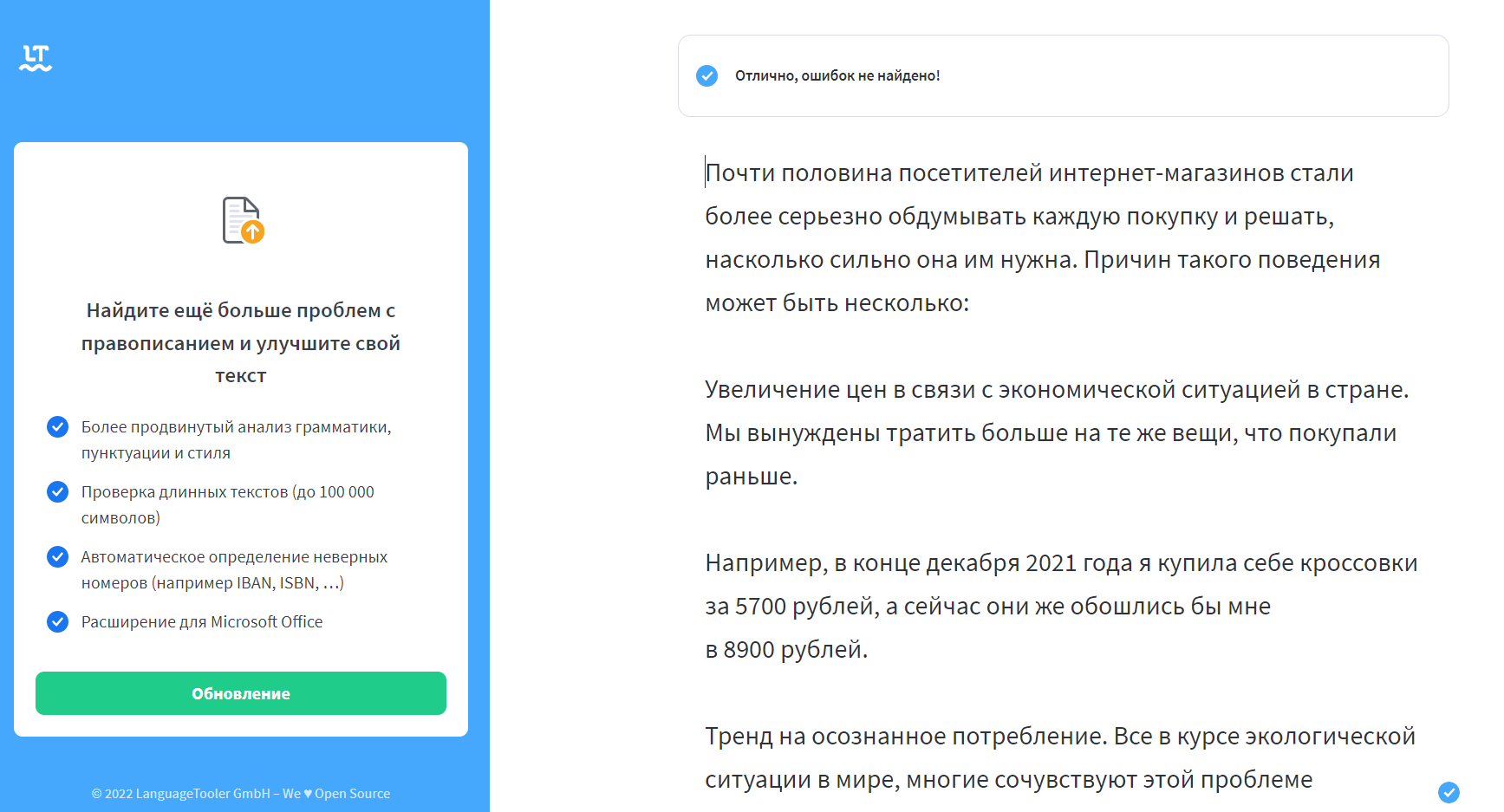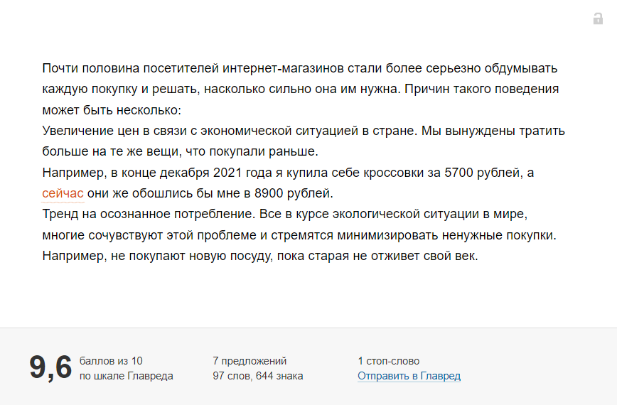Рекомендую всем прогонять тексты через Главред — даже мастеров слова эта программа может натолкнуть на какие-то мысли: где лучше добавить конкретики, что переформулировать. Например, я после прогона фрагмента из своей статьи через Главред подумала, что стоило уточнить, что сейчас — это в июне 2022 года, когда и была написана эта статья.