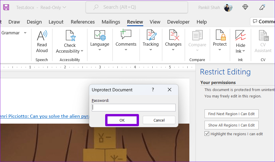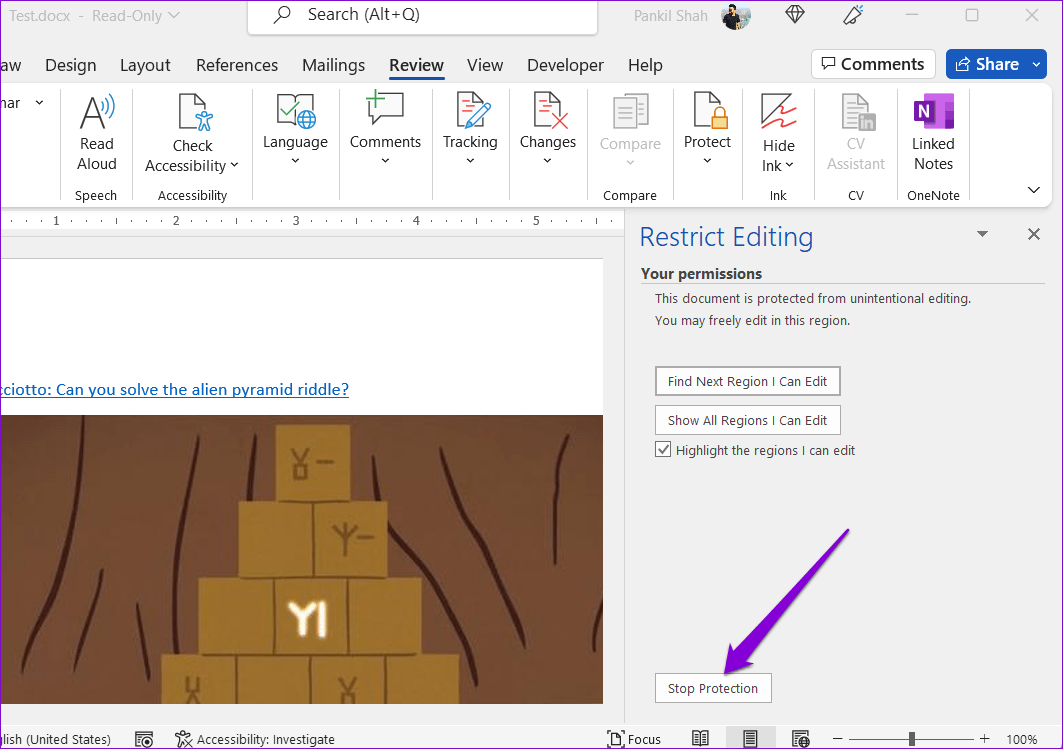 Шаг 3: На панели «Ограничить редактирование», которая появляется справа, нажмите кнопку «Остановить защиту».