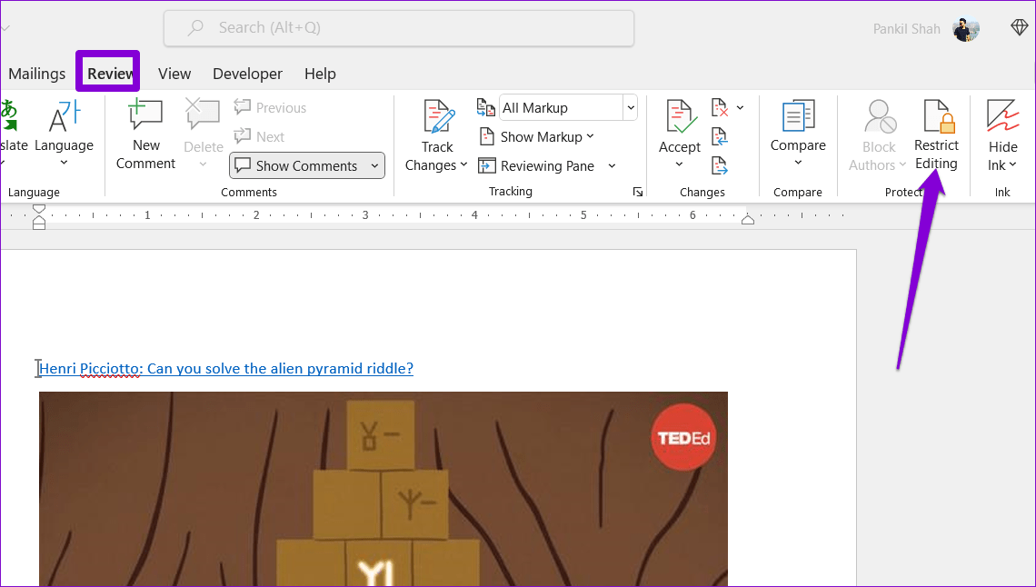 Шаг 2: На вкладке «Обзор» выберите параметр «Ограничить редактирование» в группе «Защитить».