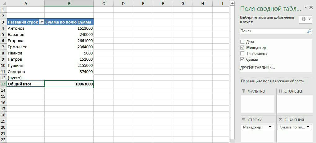 Осталось показать, как работать со сводными таблицами в Excel. Снимая и устанавливая галочки в списке полей, меняем вид отчета. Выведем сумму сделок каждого менеджера.