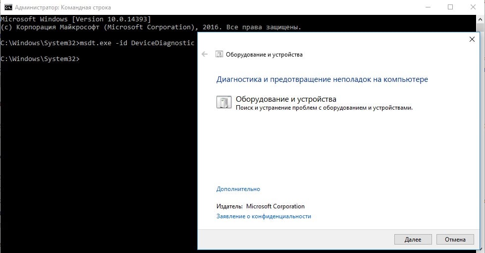 Инструмент, о котором идет речь в разделе, создан специально для того, чтобы исправить ошибки подключения оборудования. Таким образом он с большой долей вероятности может помочь и сейчас. Он может присутствовать в меню «Параметры» Windows, но часто пишут, что его там нет. Чтобы точно запустить инструмент, стоит в командную строку вставить msdt.exe -id DeviceDiagnostic. Остается только следовать подсказкам мастера.