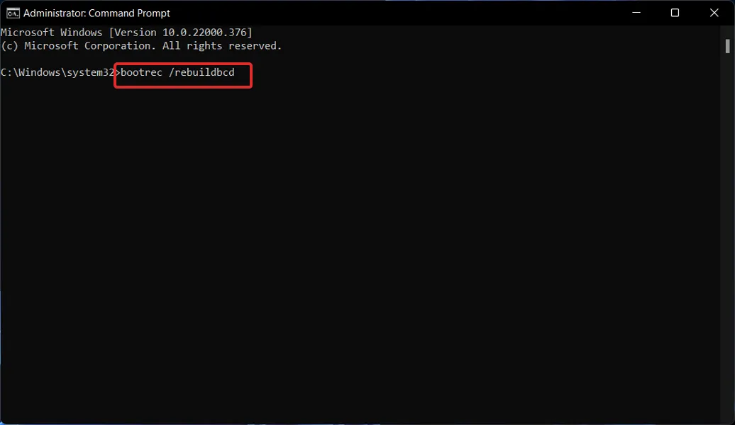 Как только вы окажетесь в командной строке, введите или вставьте следующую команду и нажмите Enter. Если программа находит установку Windows и спрашивает Добавить установку в список загрузки? , нажмите Yна клавиатуре:bootrec /rebuildbcd