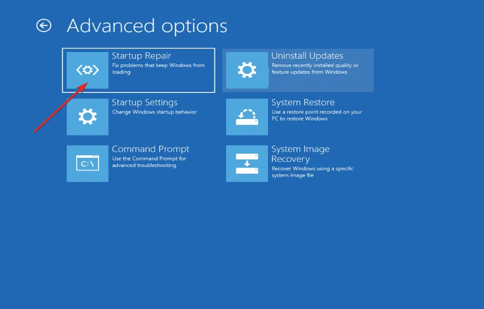 Затем нажмите « Дополнительные параметры», а затем « Восстановление при загрузке» .