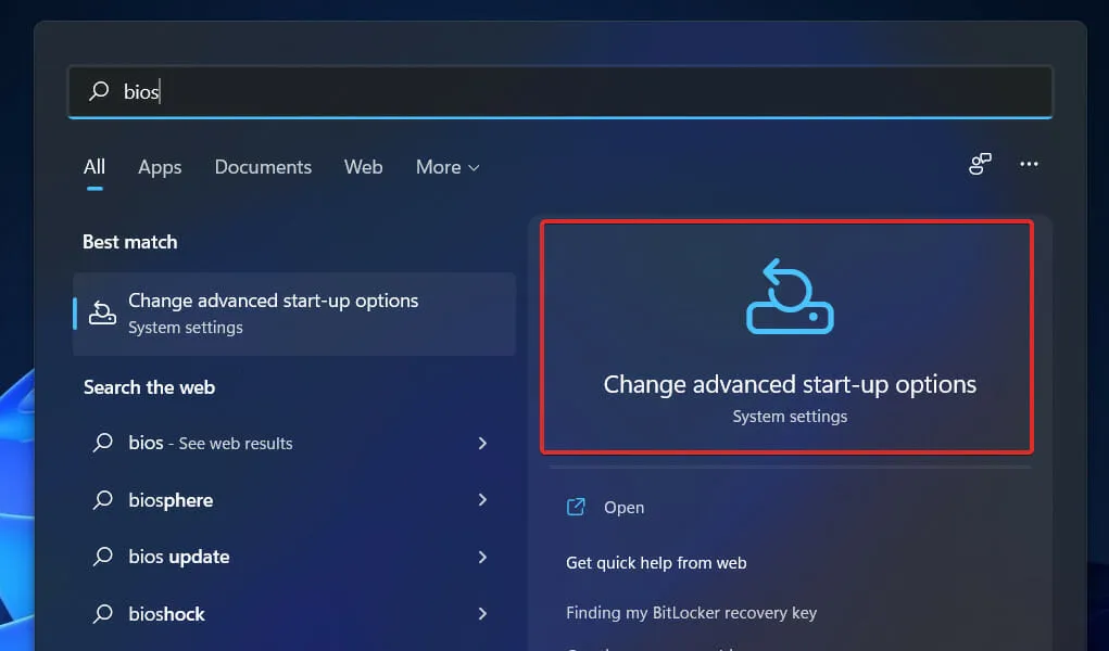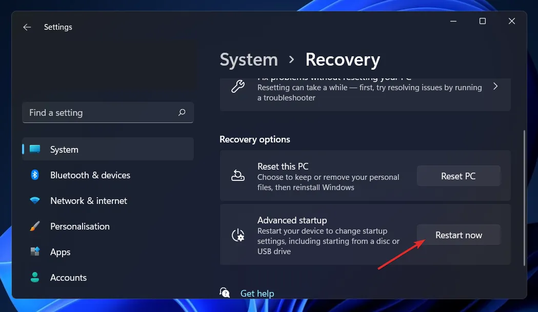Теперь нажмите кнопку « Перезагрузить сейчас» рядом с « Расширенный запуск» .