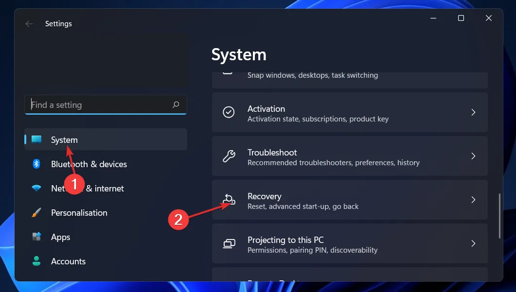 Нажмите Windowsклавишу +, Iчтобы открыть приложение « Настройки» , и перейдите к « Система» на левой панели, а затем к « Восстановление» с правой стороны.