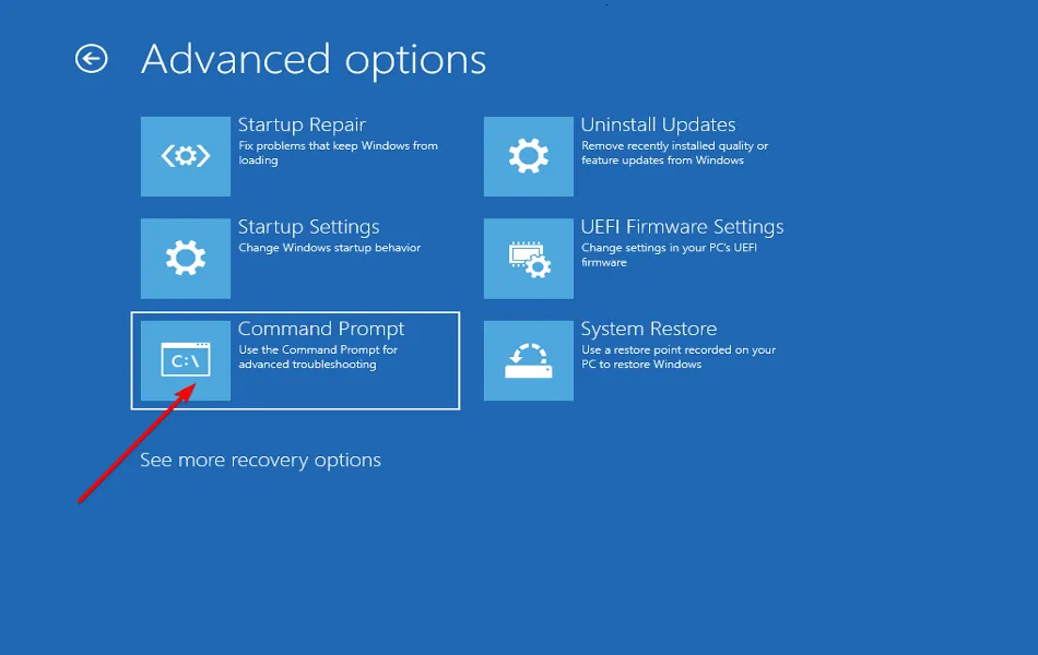 Затем нажмите « Дополнительные параметры», а затем « Командная строка» .