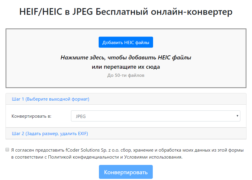 Heic2Jpeg.com — есть русский язык и возможность выбора качества конвертации. Предельно простой в эксплуатации инструмент для быстрого преобразования: