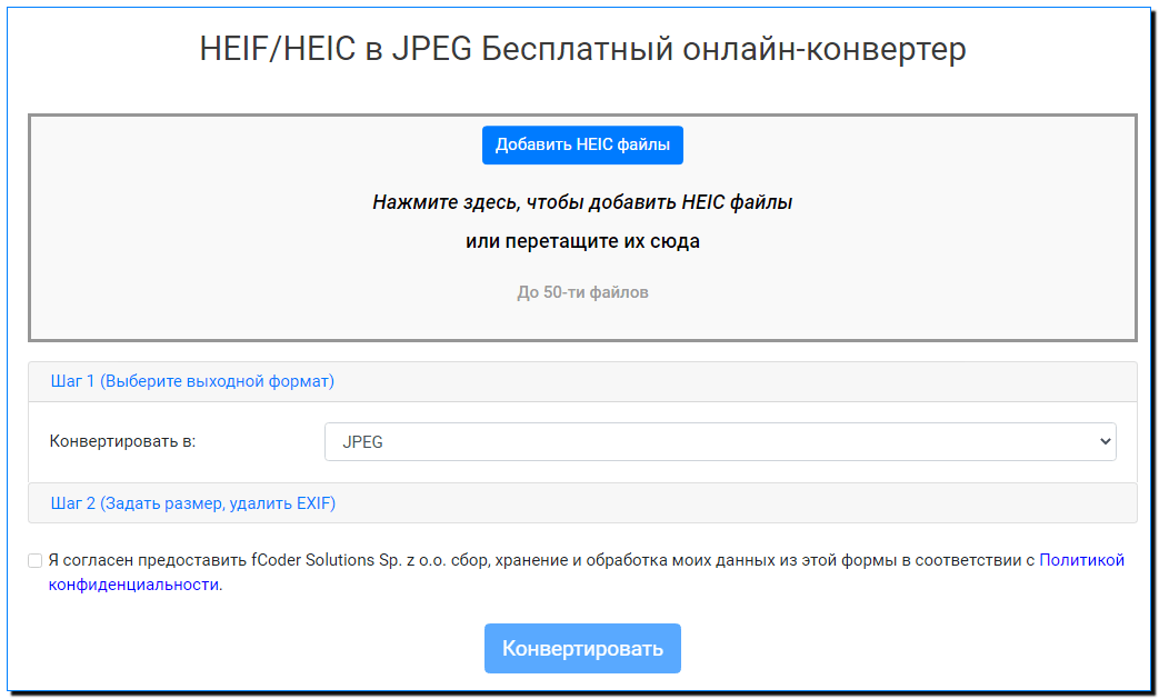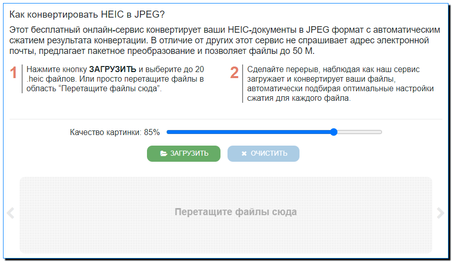 heic2jpeg.com/ru Также отличный онлайн сервис для конвертации HEIC в JPEG. Загрузка на него происходит довольно просто, до 50м. При загрузки не нужно регистрироваться и указывать ваш электронный адрес. Как он работает, я описывать не буду, так как это хорошо видно из текста со скриншота.