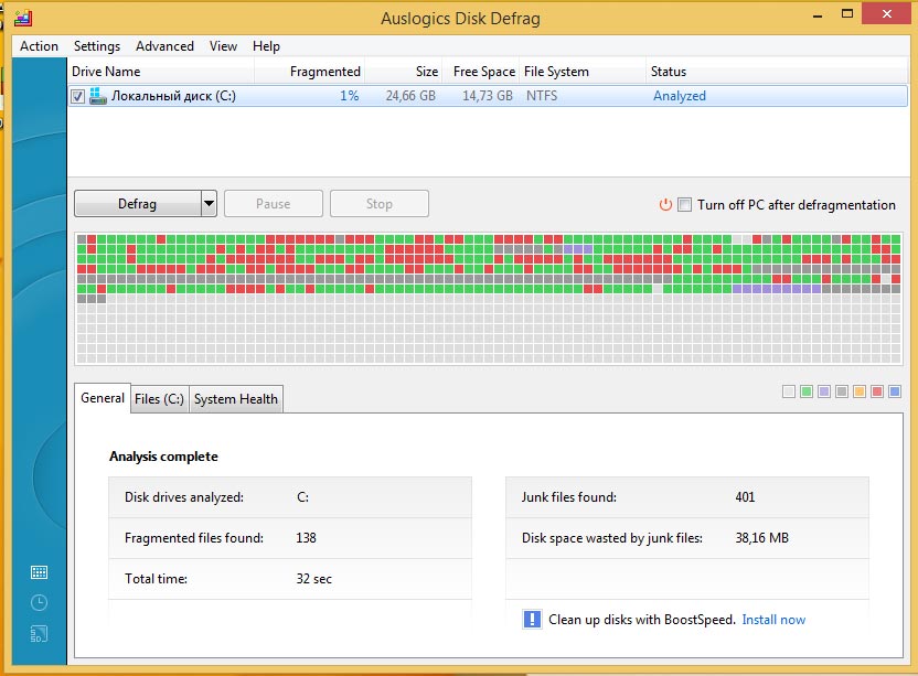 Что касается дефрагментаторов сторонних производителей, то, повторюсь, можете использовать программу Defraggler, O&O Defrag Free и т.д. Я вот, например, пользуюсь программой Auslogics BoostSpeed. Этот комплекс имеет в своем арсенале не только средства для очистки системы от мусора, но и для дефрагментации диска.