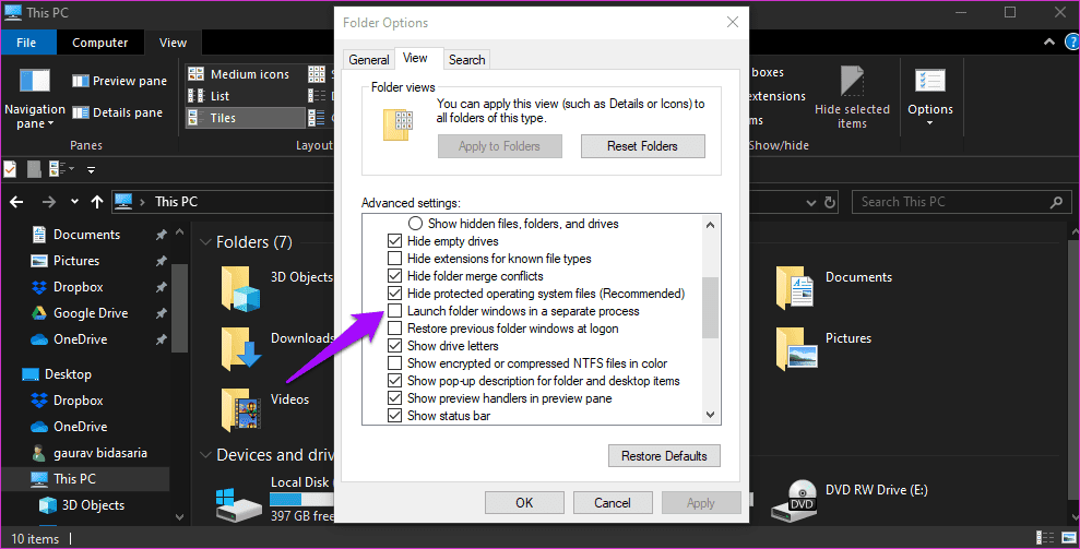 Вернитесь к «Изменить папку и параметры поиска», как вы делали на втором шаге выше, и установите флажок перед параметром «Запускать окна папки в отдельном процессе». Сохраните и повторите попытку. Вы всегда можете переключиться позже.