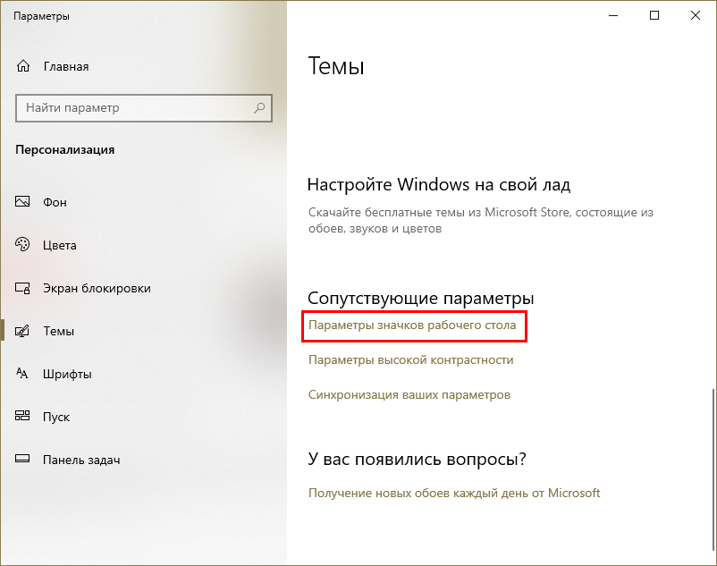 - Откроется меню настроек, где следует перейти в раздел «Темы» и нажать на «Параметры значков рабочего стола»;
