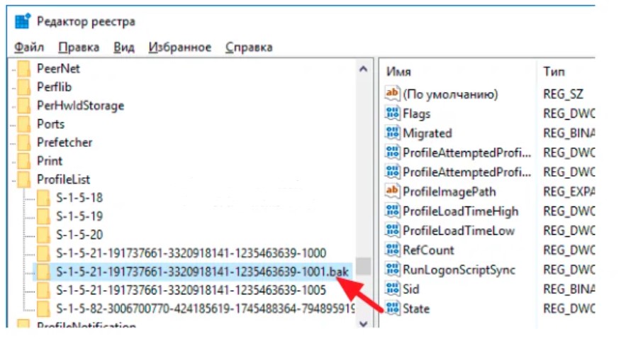Если в каталоге ProfileList есть подраздел с приставкой .bak в конце имени, выделите его мышкой и посмотрите, совпадает ли значение параметра ProfileImagePath в правой части окна редактора с путём к папке пользователя. Если не совпадает, замените значение параметра полным путём к пользовательской папке. Если в каталоге ProfileList имеется подраздел точно с таким же именем, что и подраздел с приставкой .bak, удалите его, а затем переименуйте подраздел с .bak, удалив одну лишь приставку. Закройте редактор, перезагрузитесь и войдите в систему под учёткой, которая выдавала ошибку.