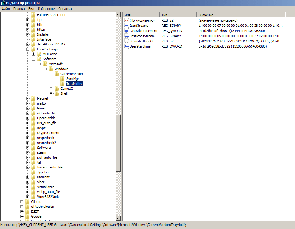 в навигаторе редактора реестра движемся по следующему пути: HKEY_CURRENT_USER\Software\Classes\Local Settings\Software\Microsoft\Windows\CurrentVersion\TrayNotify, вкладку TrayNotify выделяем левой клавишей мыши