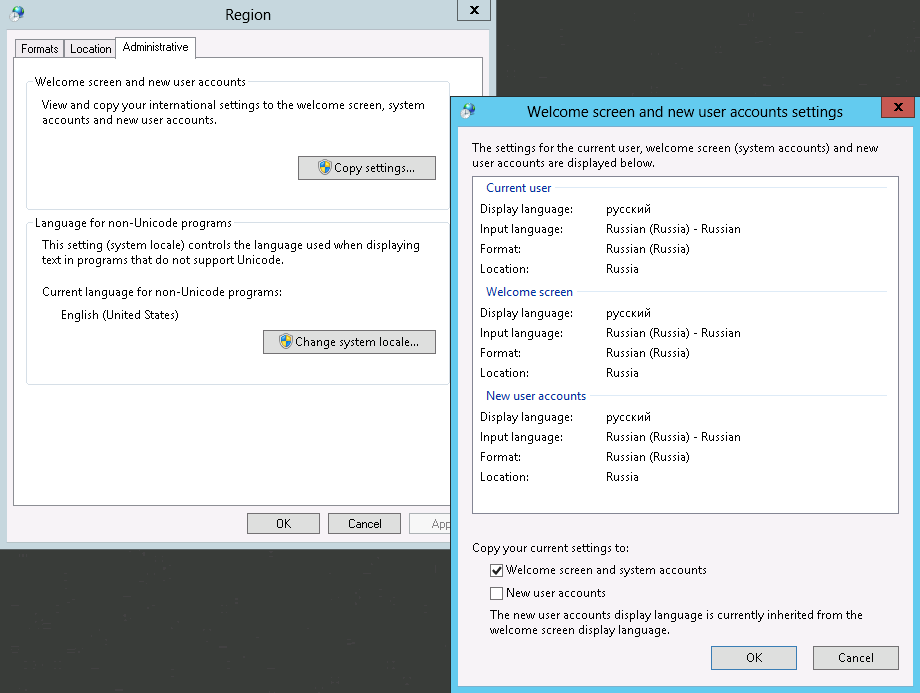 • Copy settings (копировать параметры). Эта настройка отвечает за настройки языка по умолчанию для вновь создаваемых учетных записей пользователей, а также для системной учетной записи и окна приветствия (Welcome screen). Поскольку большинство сервисов в Windows работают под учетной записью системы, именно эта настройка влияет на то, на какой язык они будут использовать.