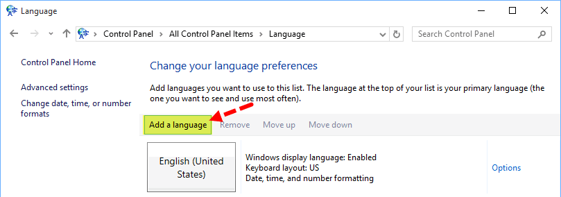 Если сервер имеет доступ в Интернет, то можно установить языковой пакет с сайта Windows Update. Для этого открываем Панель Control Panel и переходим в раздел Language. Здесь показаны языки, использующиеся в системе на данный момент. Для добавления нового языка жмем на кнопку «Add a language».