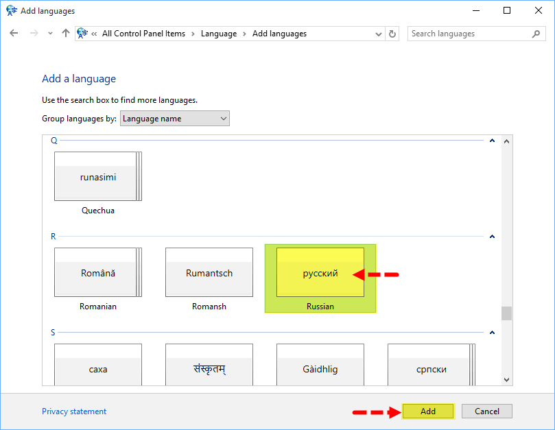 В открывшемся окне выбираем нужный язык и жмем кнопку «Add».
