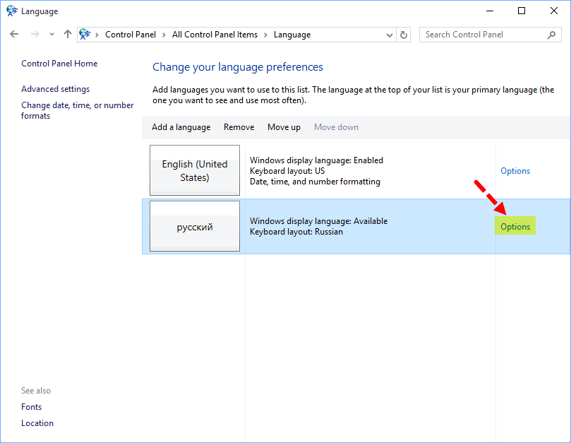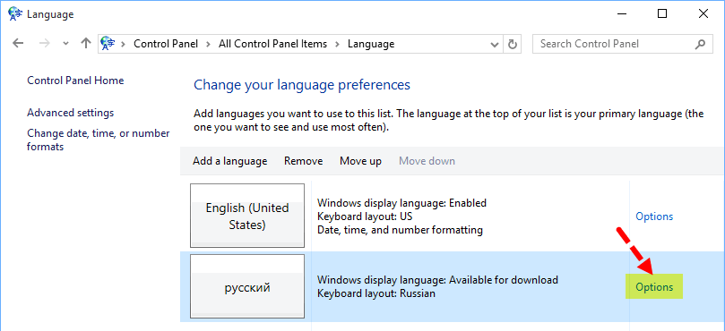 8. Когда язык будет установлен, вам необходимо ещё раз нажать Options возле русского языка: