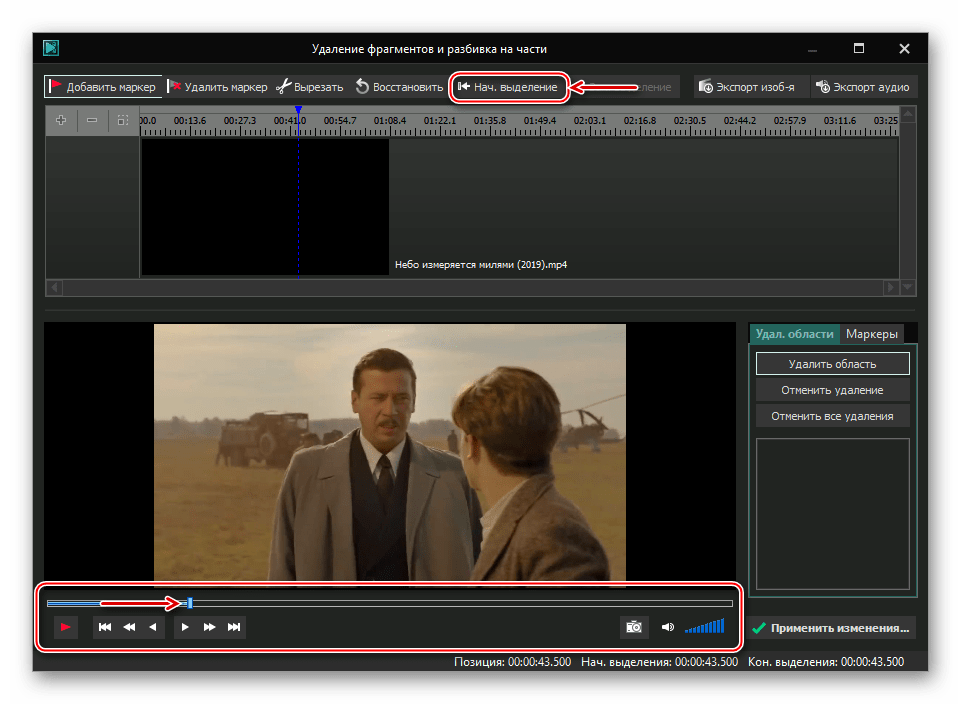 Приступаем к обрезке видео. Сначала устанавливаем ползунок полосы воспроизведения в начальную точку и нажимаем «Начать выделение».