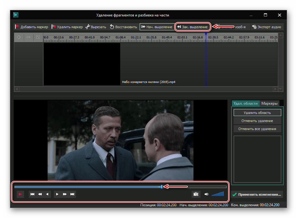 Теперь определяем конец вырезаемого фрагмента и жмем «Закончить выделение»