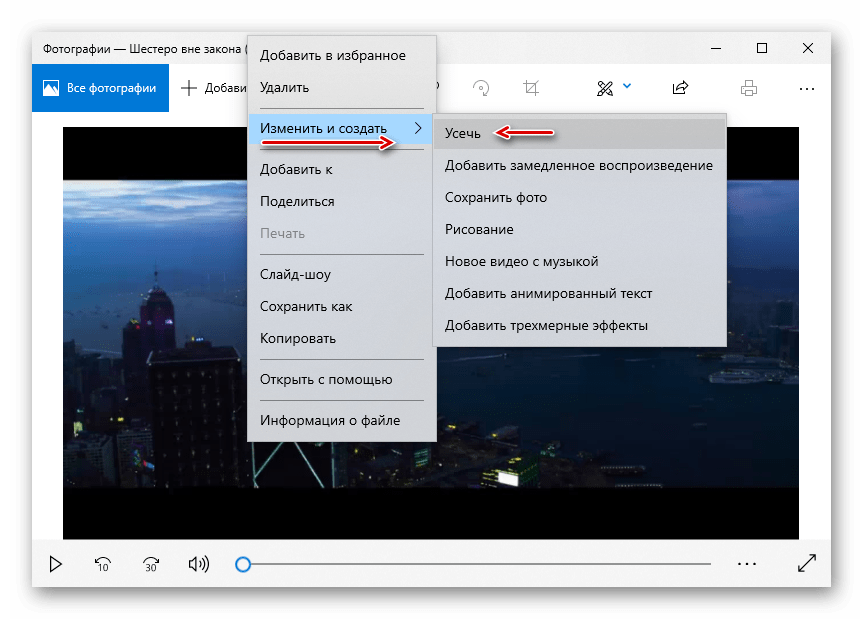 Либо щелкаем правой кнопкой мыши по области воспроизведения видео, в контекстном меню раскрываем вкладку «Изменить и создать» и жмем «Усечь».