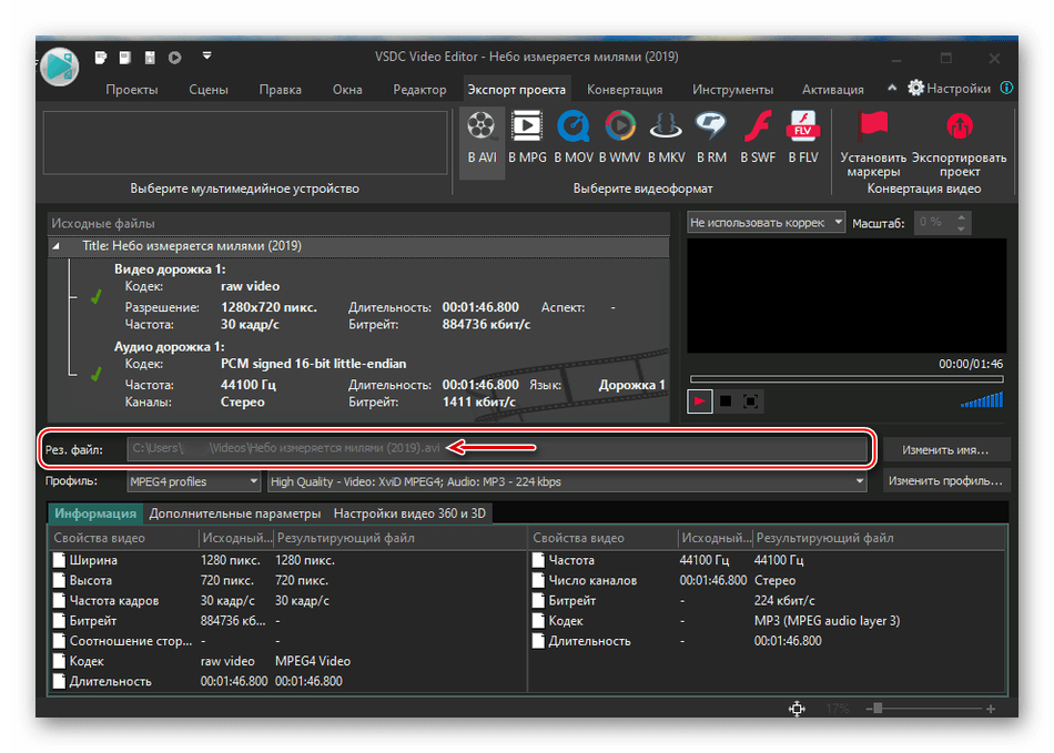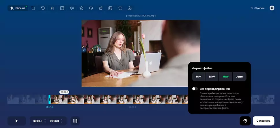 Укажите подходящий видеоформат и экспортируйте результат. Активировав режим«Без перекодирования» , вы сохраните отрывок с параметрами исходника, тем самым ускорив процесс обработки.