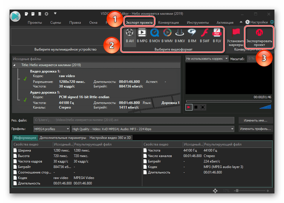Переходим во вкладку «Экспорт проекта», выбираем формат, в котором хотим сохранить ролик, и жмем «Экспортировать проект».