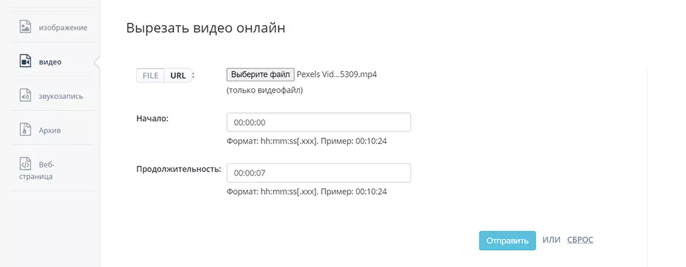 Введите ссылку или залейте видеофайл с компьютера.Установите время начала отрезка с точностью до секунды. Затем введите желаемую продолжительность отрывка.