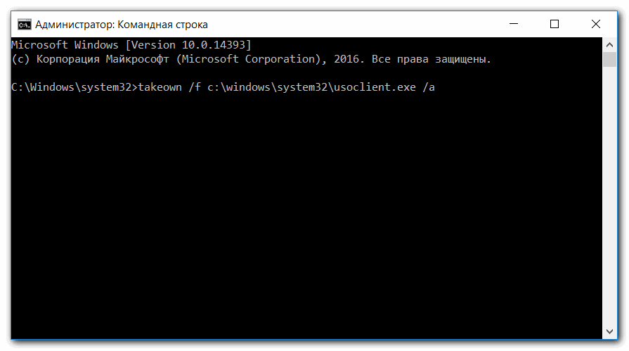 - «takeown /f c:\windows\system32\usoclient.exe /a. Разумеется, точка в конце не требуется.