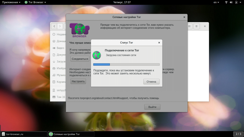 - Нажать “Соединиться” в окне, появляющемся сразу после запуска программы Тор. Возможна некоторая задержка, но зелёный индикатор будет показывать прогресс установки трёхуровневой линии.