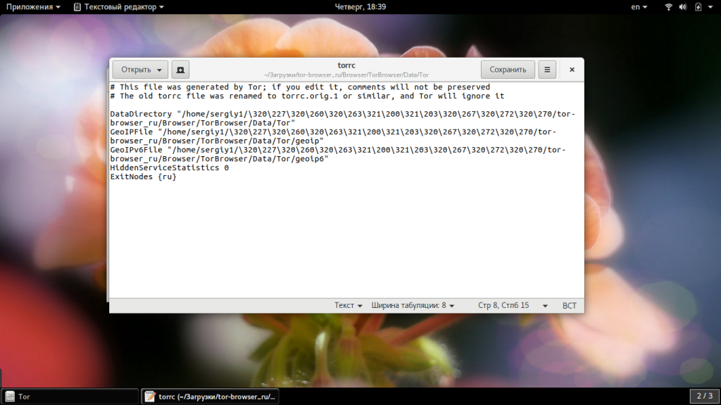 Мы обязательно рассмотрим настройку Tor более подробно в одной из следующих статей, а сейчас только немного пробежимся по основным параметрам, которые вы можете здесь изменить. Допустим, вы хотите, чтобы выбирались выходные узлы только из России, то есть у вас был только российский IP. Откройте ваш файл torrc и добавьте в него такую строчку: