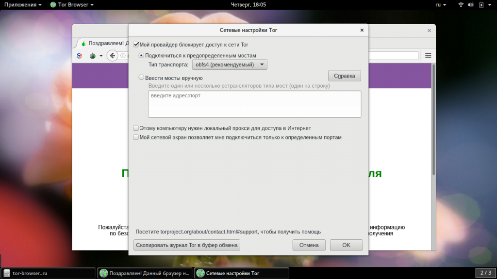 - Если Tor в вашей стране запрещён, вы можете использовать мосты (bridges), позволяющие обойти блокировку. Нажмите на соответствующую кнопку внизу экрана, а потом выберите один из режимов мостов.