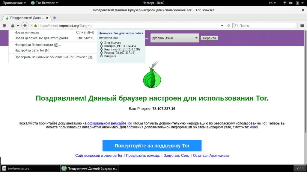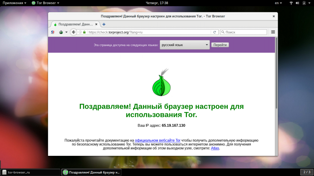 Чтобы проверить действительно ли работает Tor и ваш ip адрес скрыт, откройте ссылку по центру страницы: