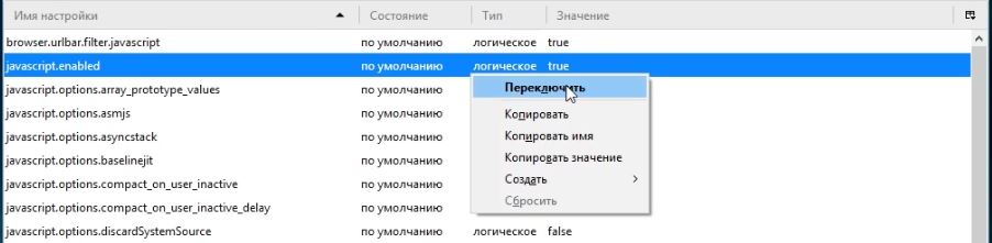 Здесь нам нужно настроить работу через proxy –сервер (кроме того, если есть желание, да и в целях большей безопасности, мы сможем отключить JavaScript). Ниже приведена таблица параметров и значения, которые нужно присвоить (вписать) каждому указанному параметру (значения true/false не вписываются, а переключаются кнопкой):