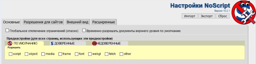 - NoScript. Включение функции гарантирует максимальную защиту от уязвимостей разных сриптов. Приложение разрешает только активное содержимое для проверенных доменов.