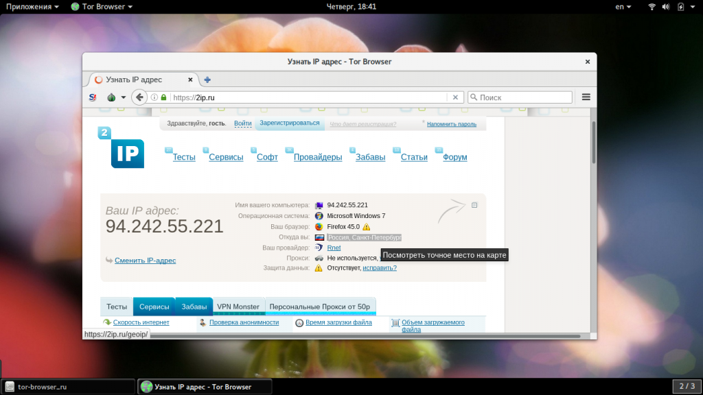 Для интереса или с целью контроля легко проверить реальность шифрования данных при работе через Tor-браузер. Любой сервис, позволяющий узнавать с какого IP-адреса осуществляется выход в Сеть, покажет совершенно другое местонахождение.