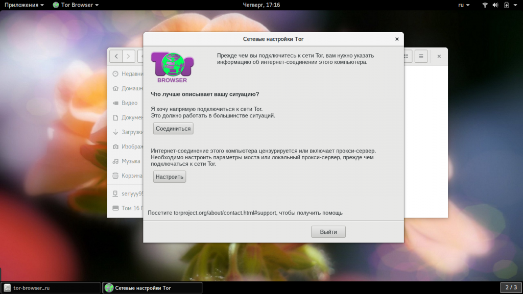 При первом запуске программа спросит как подключаться к сети Tor, напрямую или используя прокси. В большинстве случаев подходит прямое подключение и необходимо нажать кнопку «Соединится»: