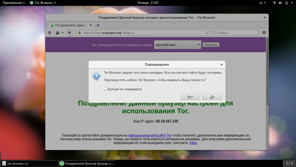 Также, с помощью того же значка вы можете полностью перезапустить браузер и получить полностью новую конфигурацию сети. Для этого нажмите кнопку «Изменить личность», а затем подтвердите закрытие всех вкладок и перезапуск: