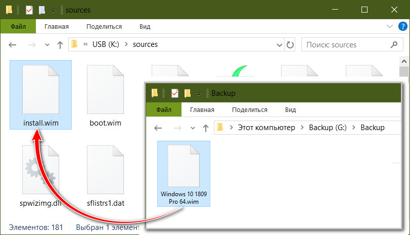 Итак, Dism++ создаёт бэкап Windows в формате WIM-файла – того же, что используется для хранения чистого дистрибутива системы. Подменив в установочном носителе исходный файл install.wim на файл нашего бэкапа, переименованный в install.wim, сможем восстанавливать Windows по типу её установки. Только без конечного этапа настройки системы и создания пользовательского профиля. Для этого необходимо создать обычную загрузочную флешку с чистым дистрибутивом своей версии и редакции Windows. Далее WIM-файл с бэкапом переименовываем в файл install.wim. На флешке заходим в папку «sources», в ней находим исходный файл install.wim, удаляем его. А на его место вставляем install.wim, переименованный из нашего бэкапа.