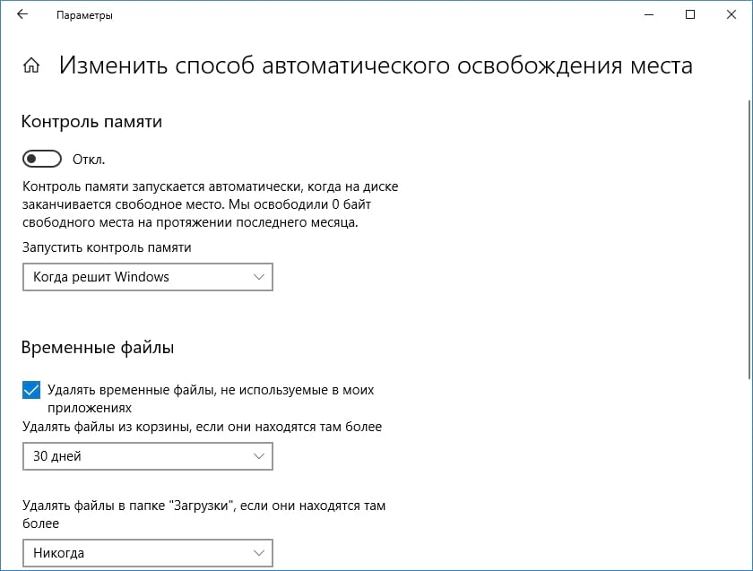 включен, операционная система«Windows 10» периодически удаляет все файлы во временных папках, которые в данный момент не используются приложениями, а также любые файлы в«Корзине» , срок хранения которых превышает тридцать дней. Однако стоит отметить, что функция«Контроль памяти» не освобождает столько дискового пространства, как сторонние специализированные приложения по очистке диска, но может помочь пользователям поддерживать свое хранилище более свободным от разных не используемых файлов, автоматически удаляя лишние из них согласно заданным параметрам. Функция была включена по умолчанию на персональных компьютерных устройствах после выпуска официального обновления операционной системы в мае 2020 года.