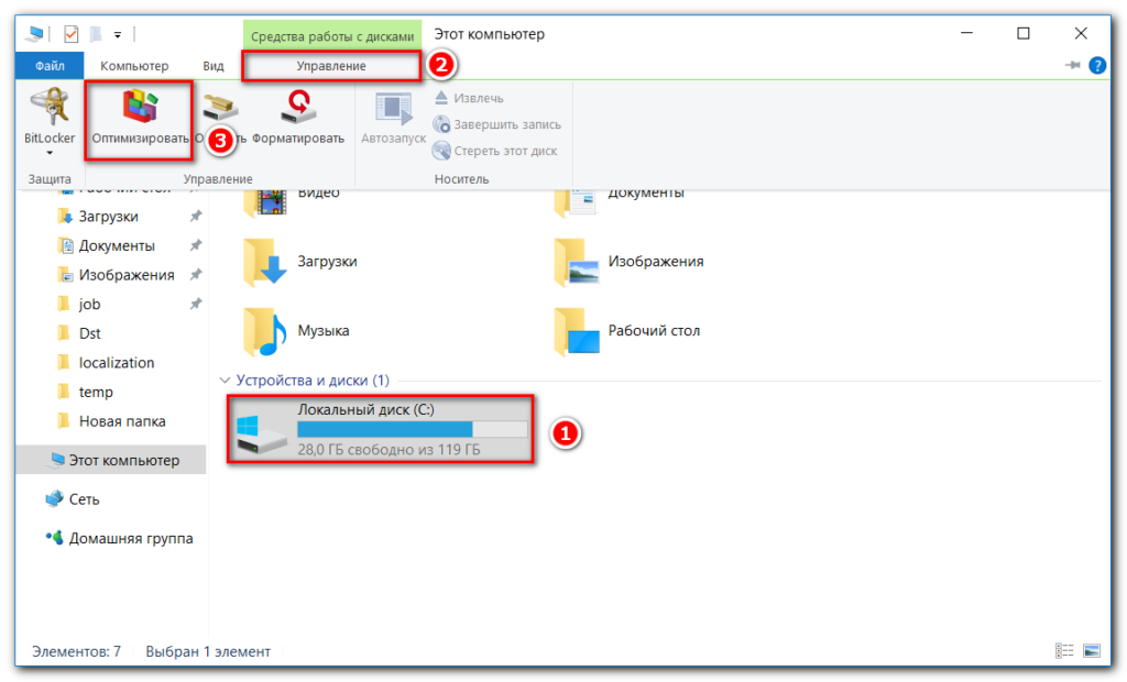 Открываем «Компьютер», жмём правой кнопкой на системном диске и выбираем «Свойства». Переходим во вкладку «Сервис» и кликаем «Оптимизировать».