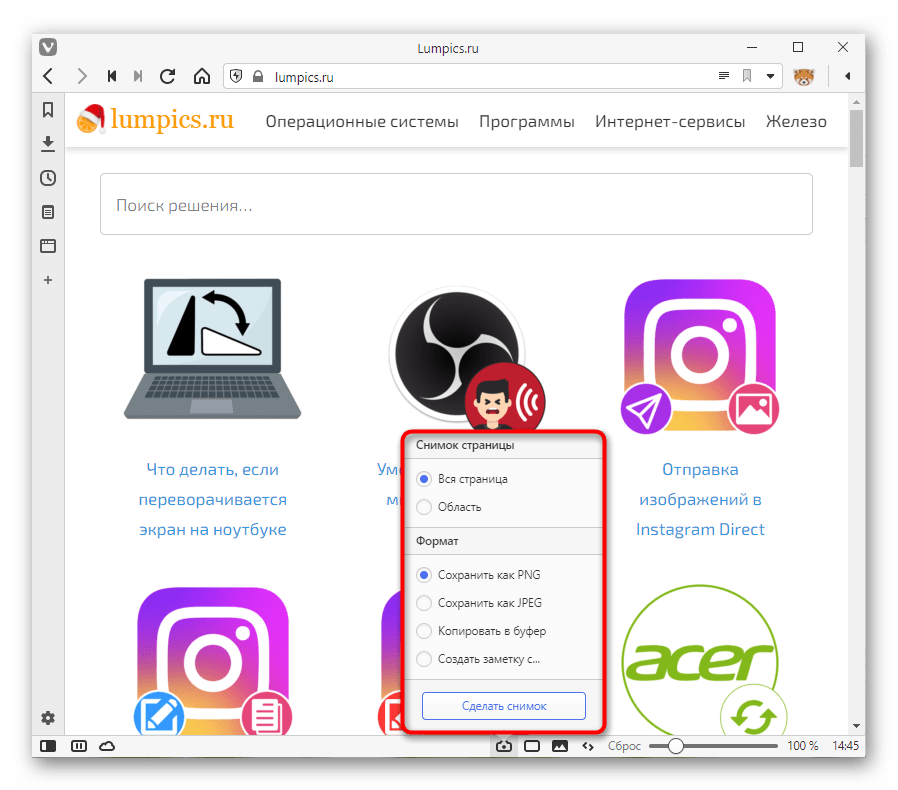 В некоторых браузерах и вовсе есть своя функция создания скриншота, снимающая надобность установки стороннего решения. Мы продемонстрируем, как создавать скриншоты в трех популярных веб-обозревателях.