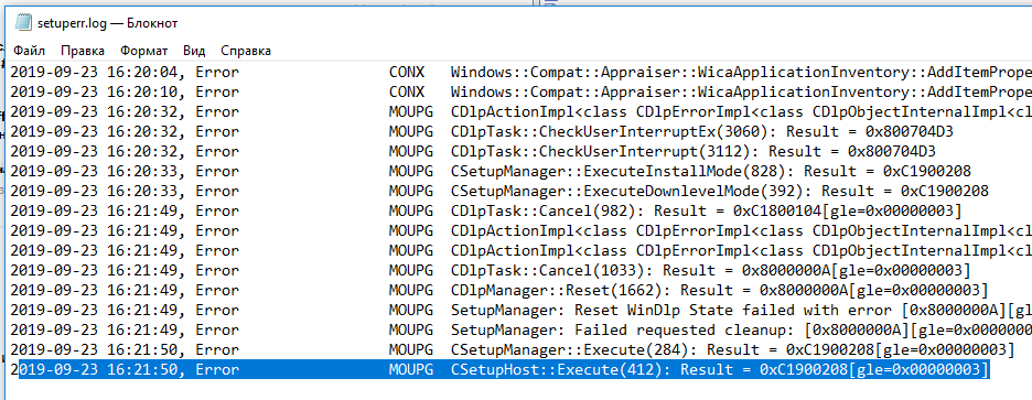 Более детально информацию о причине невозможности обновить версию Windows 10 можно получить с помощью утилиты setupdiag.exe. В моем случае в логе setuperr.log присутствовала ошибка: