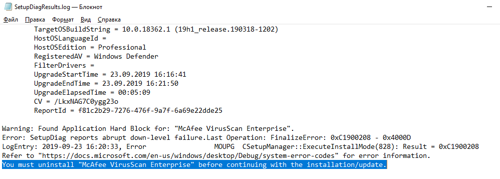 Matching Profile found: CompatBlockedApplicationAutoUninstall, FindAbruptDownlevelFailure — BEBA5BC6-6150-413E-8ACE-5E1EC8D34DD5, 55882B1A-DA3E-408A-9076-23B22A0472BD SetupDiag version: 1.6.0.0 При этом в конце журнала указано, что перед обновлением нужно удалить установленный антивирус McAfee.