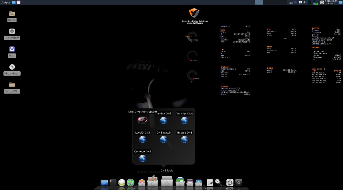 Плюс в Kodachi интегрирована поддержка DNScrypt — это протокол и одноименная утилита, шифрующая запросы к серверам OpenDNS методами эллиптической криптографии. Она устраняет целый ряд типичных проблем, вроде DNS leak и оставления следов работы в сети на серверах провайдера.