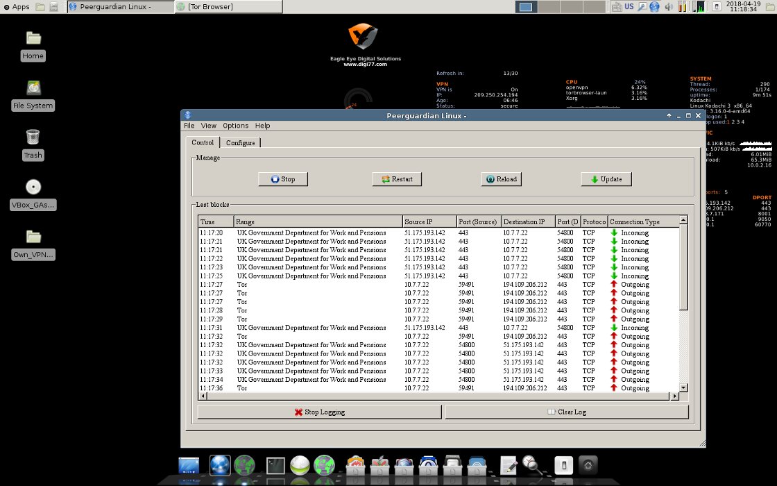 Другое отличие Kodachi — интегрированный Multi Tor для быстрой смены выходных узлов с выбором определенной страны и PeerGuardian для сокрытия своего IP-адреса в Р2Р-сетях (а также блокировки сетевых узлов из длинного черного списка).