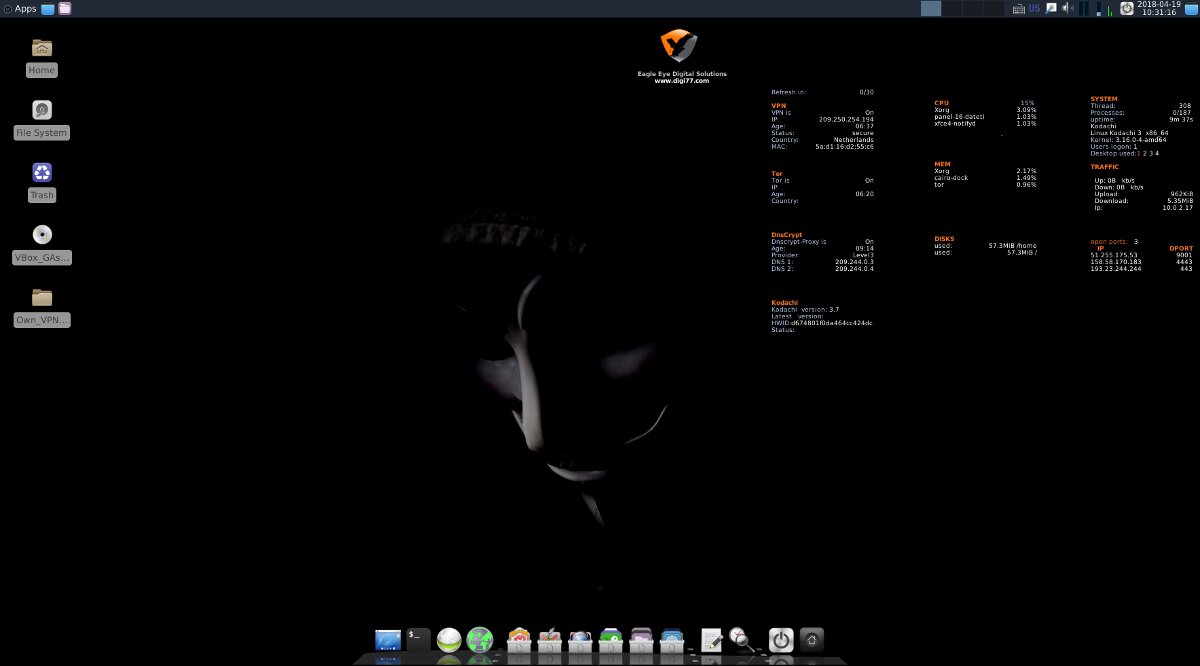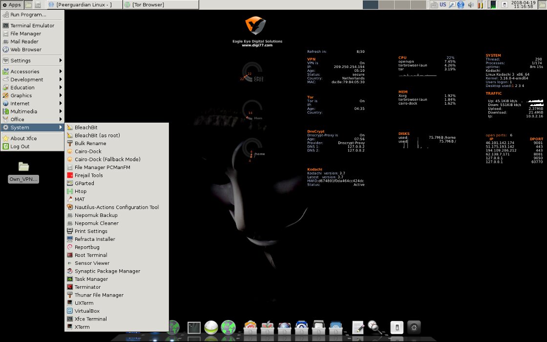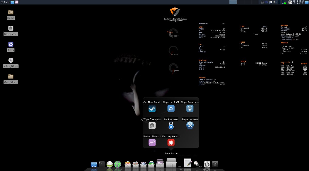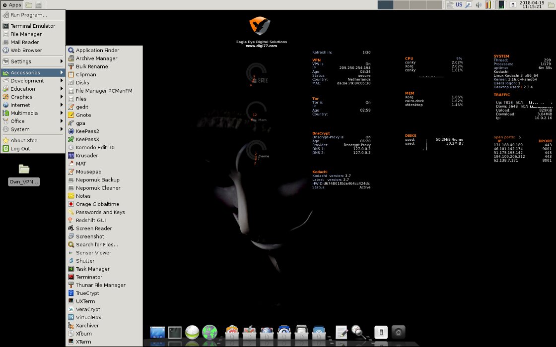 Среди ключевых особенностей Kodachi — принудительное туннелирование трафика через Tor и VPN, причем бесплатный VPN уже настроен.