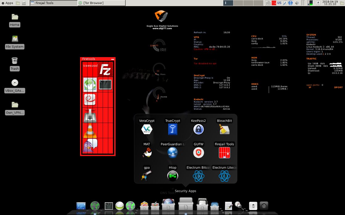 В качестве среды рабочего стола для Kodachi была выбрана Xfce, а общий интерфейс операционки стилизован под macOS. Статус подключения к Tor и VPN, а также большинство текущих параметров загрузки системы выводятся в режиме реального времени и отображаются прямо на рабочем столе.