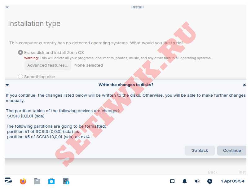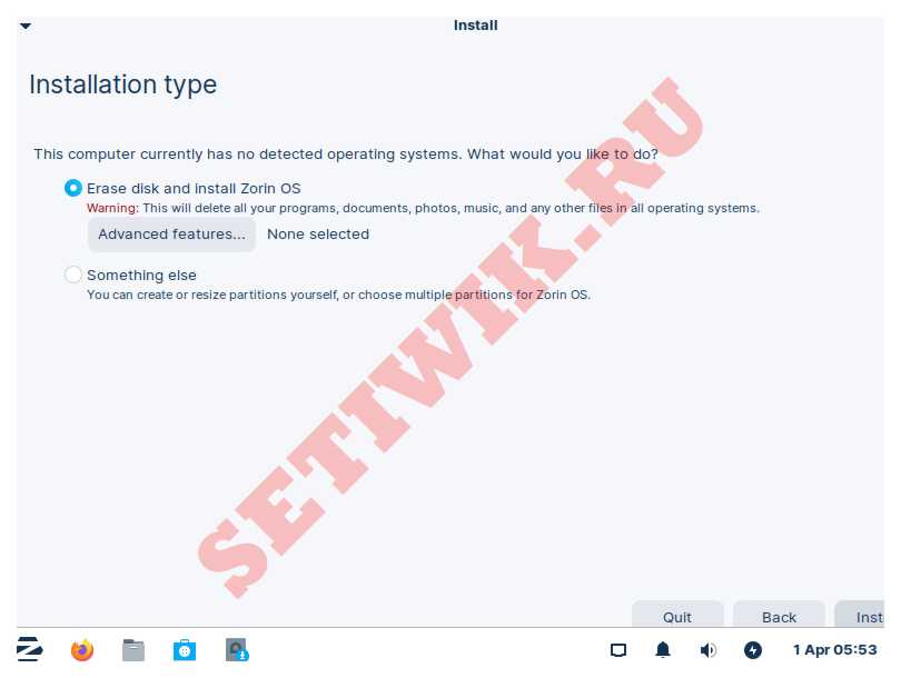 Если вы обычный пользователь, лучше всего использовать опцию Стереть диск и установить Zorin (Erase disk and Install Zorin). Но обратите внимание, что эта опция удалит все файлы на диске