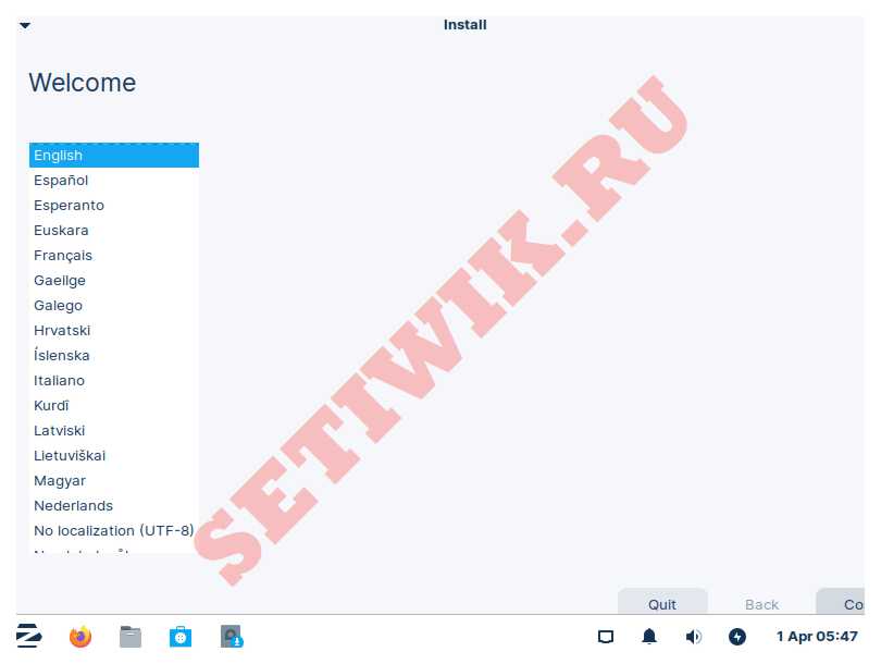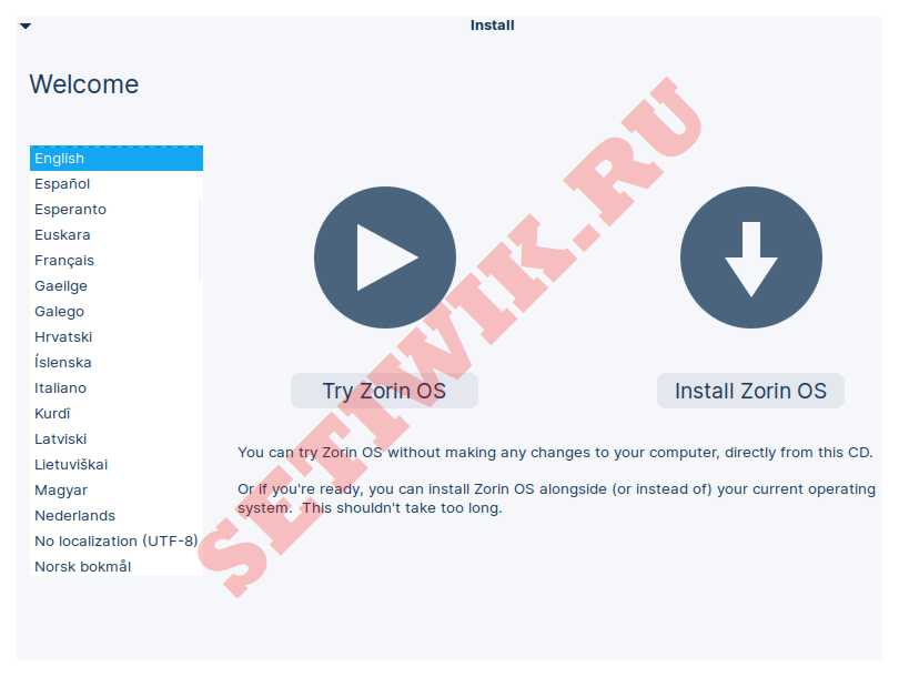 Если после входа на рабочий стол вы захотите установить Zorin OS. Тогда дважды щелкните на значок Install Zorin OS. Далее вы перейдете к следующему шагу. Первый экран установки Zorin OS — это язык. Вы должны выбрать язык, прежде чем перейти к следующему шагу.