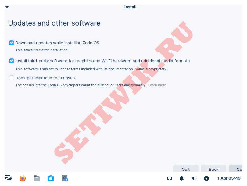 Далее спросит вас установить ли обновления при установке Zorin OS?